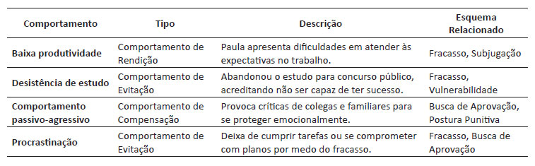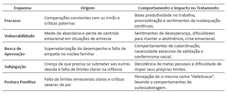 Os esquemas identificados foram analisados por meio do Young Schema Questionnaire - Short Form 3 (YSQ-S3)15. Esses esquemas refletem tanto o contexto familiar quanto os padrões atuais de comportamento. A tabela a seguir resume os esquemas mais relevantes e seus impactos no tratamento de Paula: