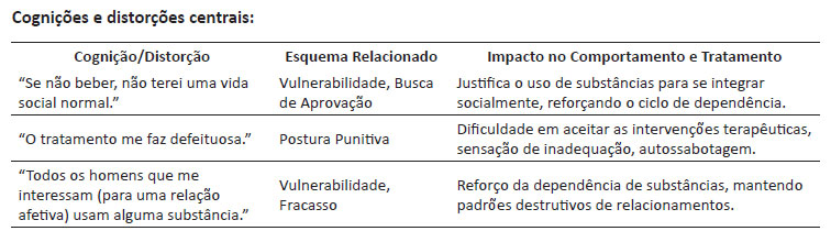 Paula, 36 anos, foi encaminhada para tratamento após uma tentativa de suicídio, com diagnóstico de TUSP e dependência de benzodiazepínicos. Ela apresenta histórico de uso de múltiplas substâncias, incluindo ecstasy, LSD e maconha, com o álcool sendo a substância de preferência. Paula cresceu em um ambiente familiar marcado por rigidez e pouca afetuosidade, o que contribuiu para o desenvolvimento de esquemas disfuncionais. Ela tem uma relação tensa com suas irmãs, o que aumenta sua vulnerabilidade a padrões de busca de aprovação e autoimagem negativa.
