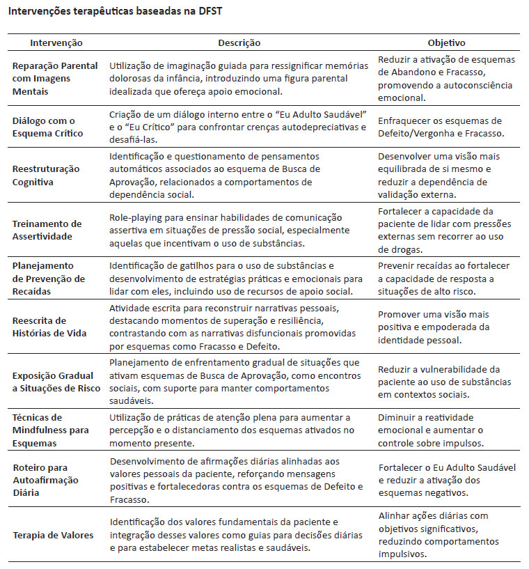 A DFST inclui técnicas tradicionais de prevenção de recaída para fatores interpessoais, afetivos e fissura, além de técnicas para estilos de enfrentamento de EIDs. Por exemplo, a análise funcional é usada para entender os episódios recentes de uso e fissura bem como o esquema desadaptativo e seu enfrentamento. São usadas técnicas de auto-monitoramento, solução de problemas e treinamento de habilidades (por exemplo, para emoções, conflitos e pressões interpessoais). As crenças disfuncionais sobre o uso de substâncias são conceituadas como um componente ou expressão dos principais esquemas subjacentes10.