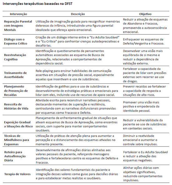 A Terapia do Esquema de Foco Duplo (DFST) é uma abordagem promissora para esses casos complexos. Ela combina intervenções específicas para TUS com estratégias para modificar esquemas mal adaptativos associados aos TP, oferecendo um modelo integrado para lidar com os desafios dessa população7.